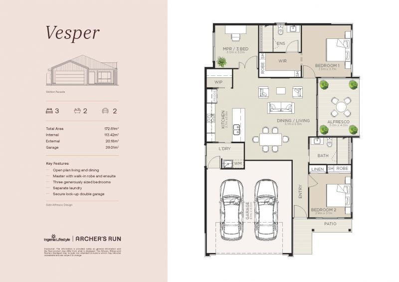 The Vesper offers a unique corner-lot layout designed to elevate everyday living. With raked ceilings, solar panels, double-glazed windows and doors, and a rainwater tank, this home blends modern luxury with eco-conscious design.
