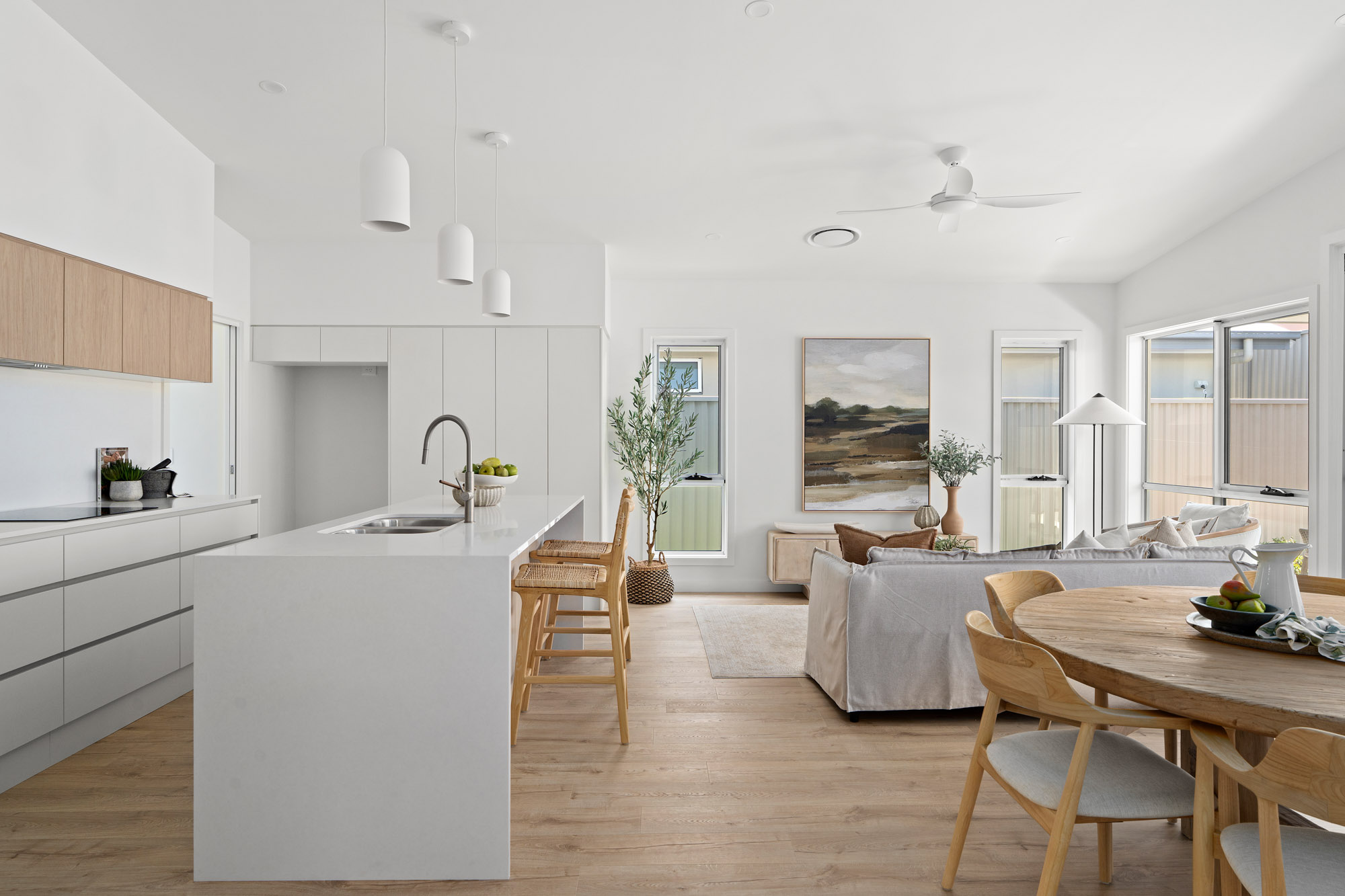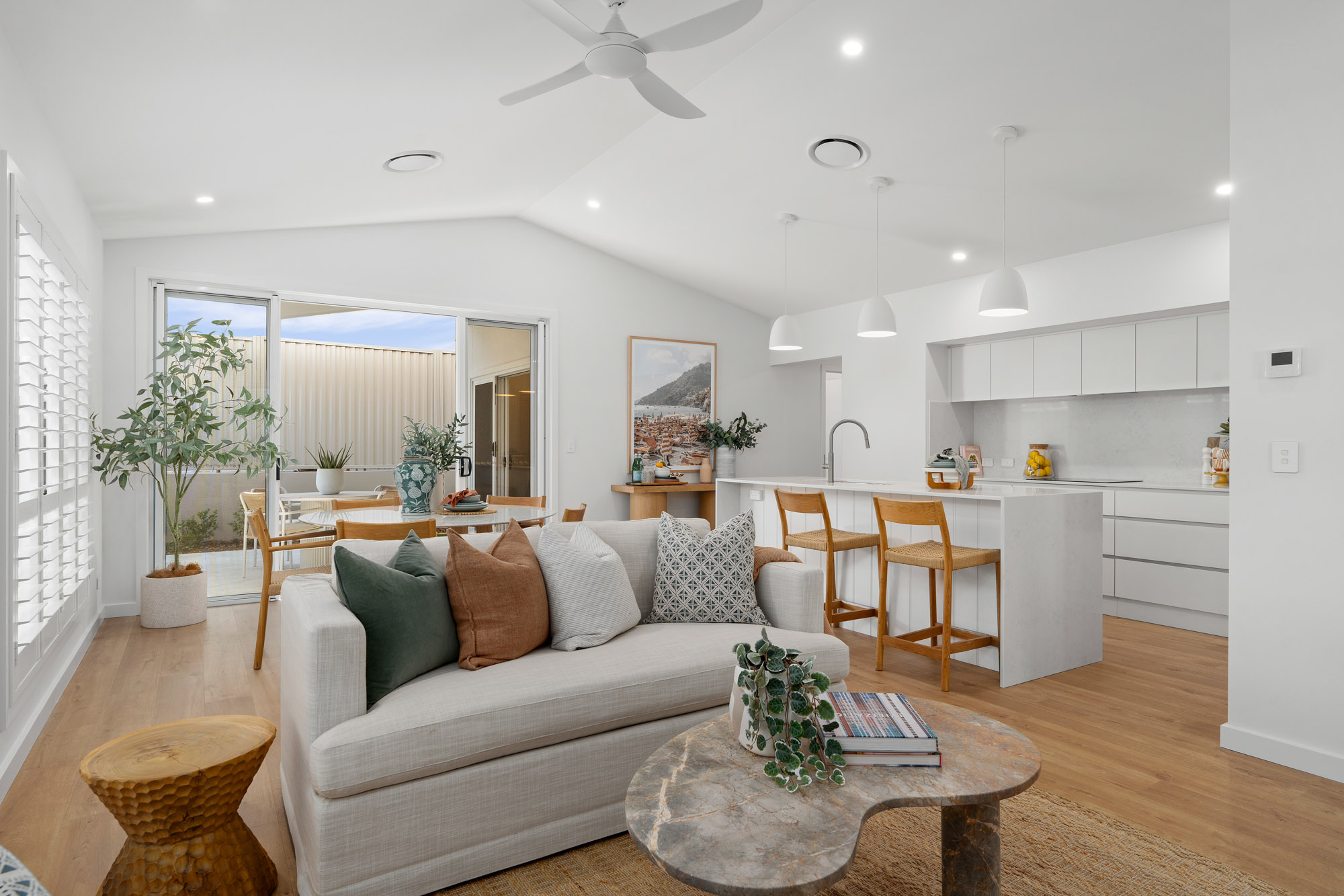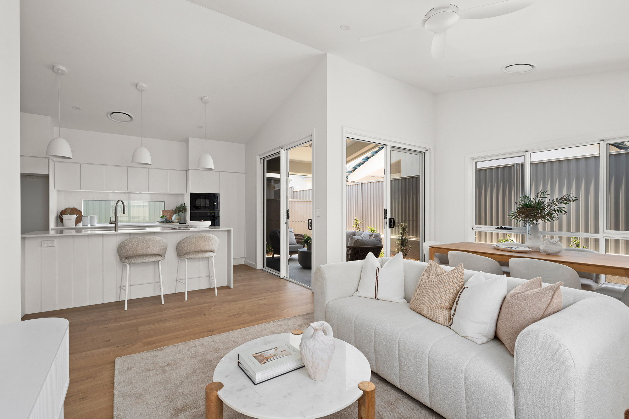 With three generous bedrooms, including a king-sized master retreat complete with walk-in robe and private ensuite, Sol offers flexibility for visiting family, guests or hobbies. The expansive open-plan kitchen, dining and living area forms the heart of the home, enhanced by striking raked ceilings that create an added sense of space and light.